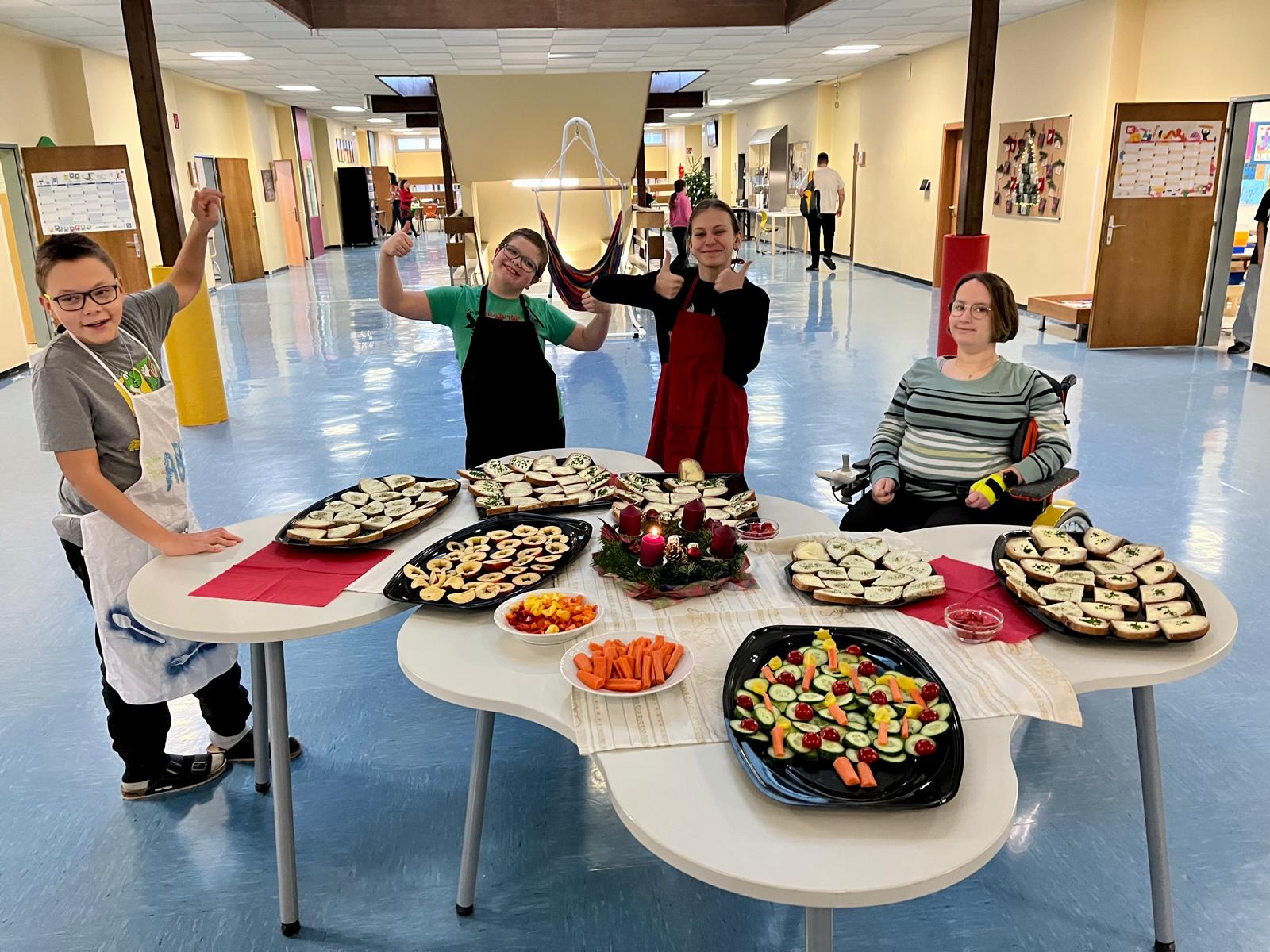 Die SchülerInnen schnitten Stern-Apfelspalten, formten einen dekorativen Gurken-Christbaum und bereiteten frische Butterbrote mit Schnittlauch zu. Zusätzlich gab es Brote mit Kürbiskernaufstrich sowie bunte Gemüsesticks aus Paprika, Paradeisern und Karotten.